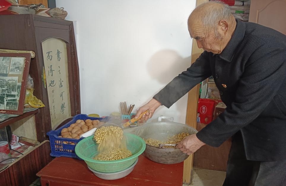 3月4日下午(农历二月二),中牟县文化广电旅游体育局工作人员来到大孟镇草场村田金汉老人家了解今年臭豆制作情况。刚到田老师家门口,一股豆香味儿扑鼻而来,此时,田老师和老伴儿正忙着把煮熟的黄豆进行虑水准备装袋捂豆一派忙活儿。